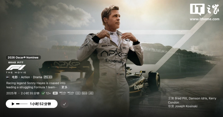 据IT之家了解,《F1:狂飙飞车》当今已在AppleTV+流媒体平台上线。