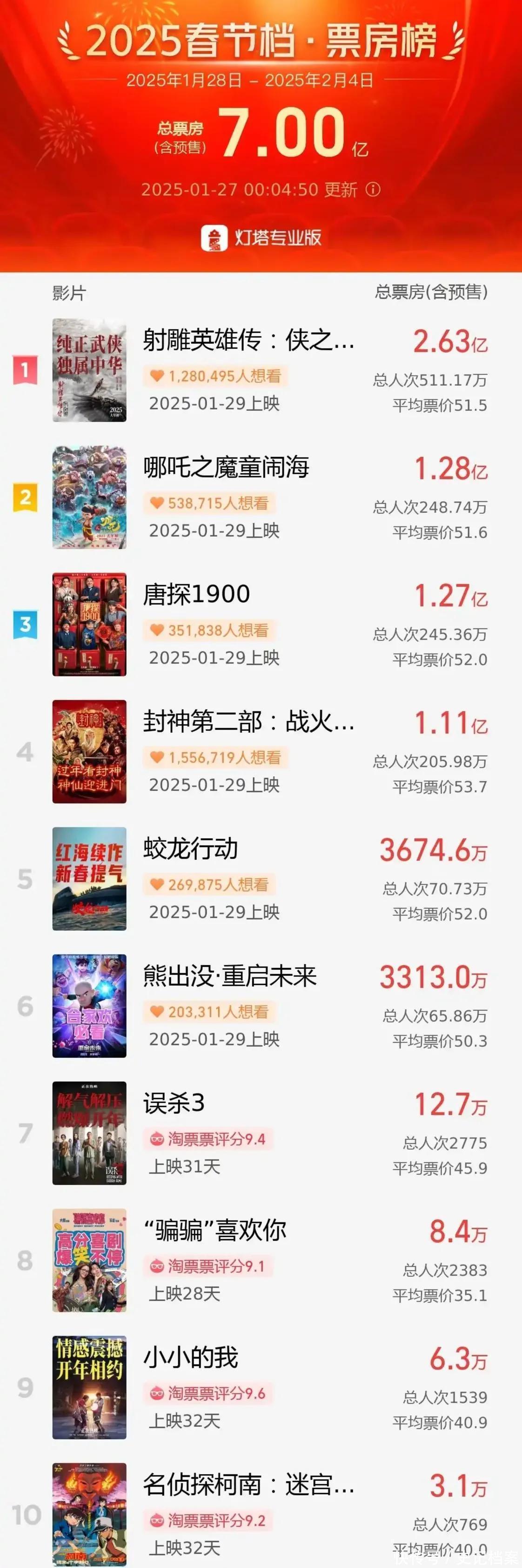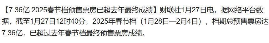本年春节档竞争强烈,有多部影片同日预售,其中就包括《射雕英豪传:侠之大者》《哪吒之魔童闹海》《唐探1900》《封神2》《蛟龙举止》等。从合座来看,这些影片的总预售票房普及旧年同期。