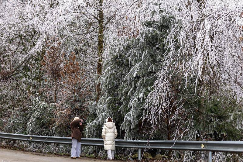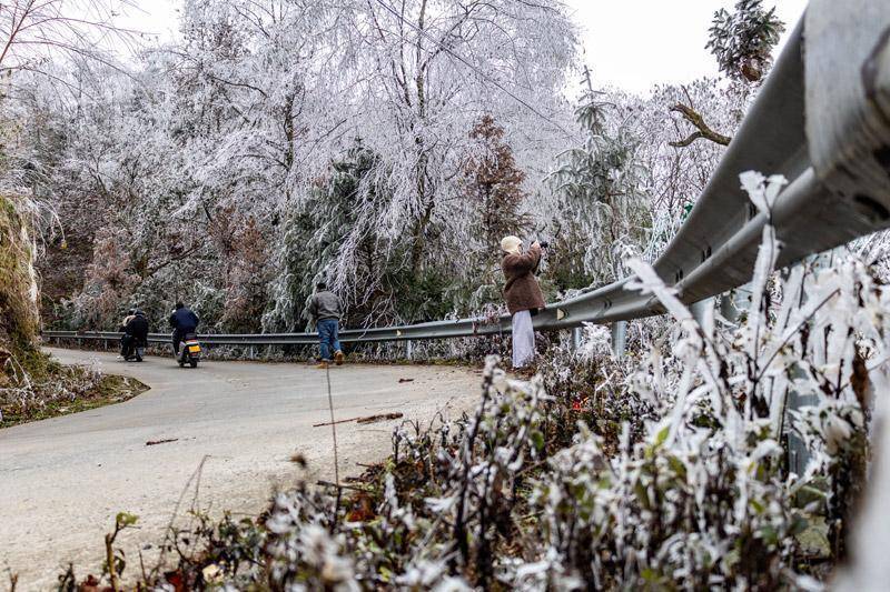 搭客在拍摄雾凇景不雅。农静摄