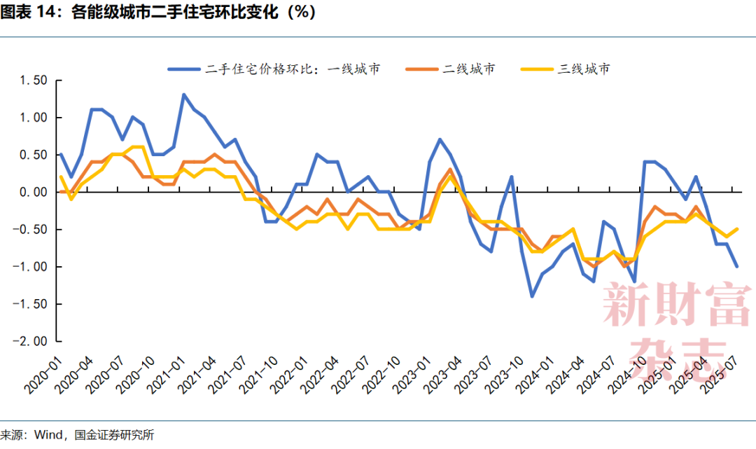 以一线城市为代表,7月房地产商场连接降温。1月至7月,房地产投资累计增速抓续回落至-12%,施工、竣工和销售数据累计同比折柳为-9.2%、-16.5%、-6.5%。值得闪耀的是,一线城市的二手房价7月环比-0.8%,这一气象被解读为商场加速出清的信号。一线城市当作最坚挺的中枢资产,其价钱的松动相通预示着所有这个词商场调度已插足后半程,是商场达成委果出清的必要经由。