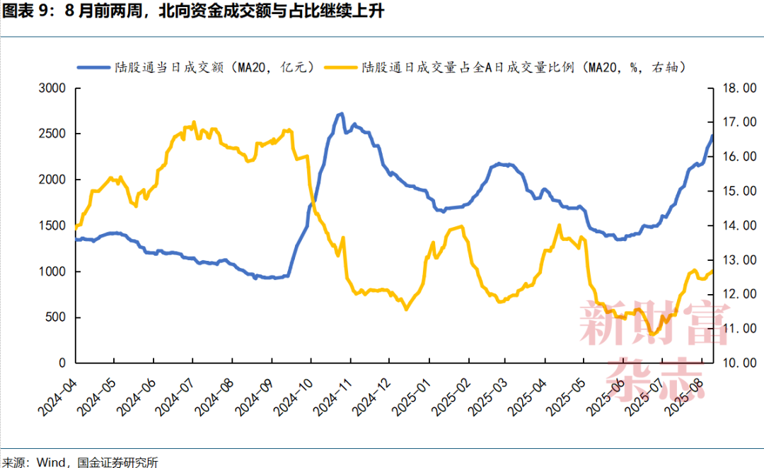 插足8月,表里资心扉延续火热。内资方面,两融资金成交额、成交占比续改进高,此前抓续净流出的机构超大单近日流出限制有所回暖,此外,商场上主要宽基的隐含波动率自8月第二周驱动昭着上升。外资方面,北向资金成交量与头部外洋中国主题ETF吸金限制均有所上升,部分外洋对冲基金也在加速净买入中国股票。举座而言,主动型、被迫型外资均展现出较7月愈加浓烈的“FOMO(错失懦弱症)”心扉。
