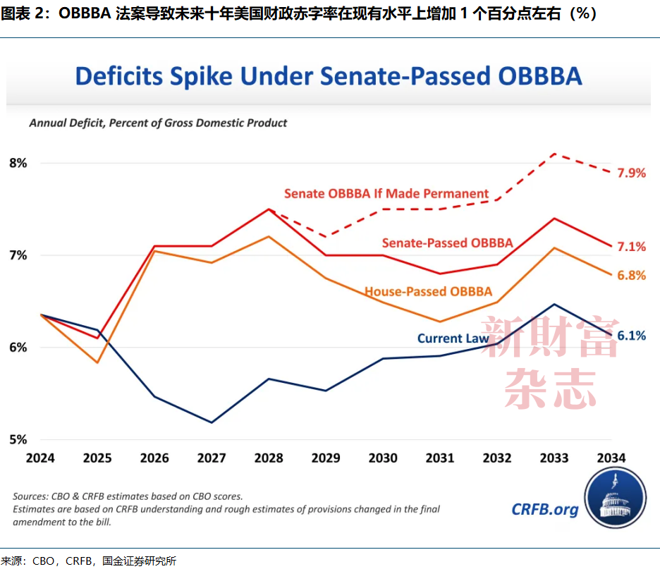 好意思国的财政预期也发生了根人道漂流,一季度因政府成果部(DOGE)鼓励的校正预期而产生的财政收缩担忧,在二季度转向,为财政延迟所取代。而因“大瑰丽法案”被建议,即好意思国洽商将来10年减税4万亿好意思元,其财政赤字占GDP比重的预期从每年6%升至7%(若该法案成为永恒性法案,则可能升至8%),财政不再收缩的预期,为好意思股乃至民众风险资产的高潮奠定了进军前提。