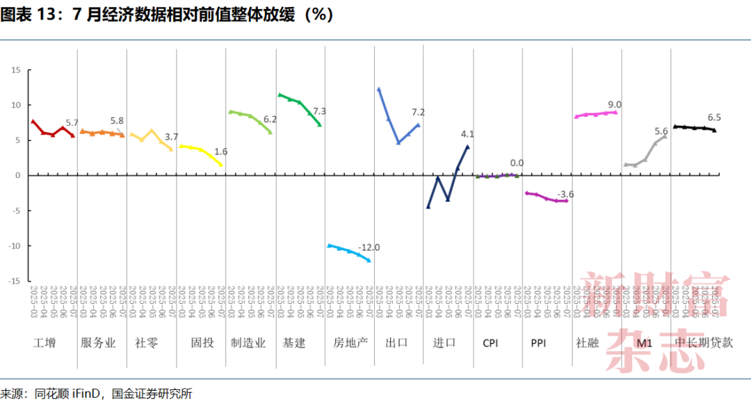 面前,A股商场的苍劲势头与7月份宏不雅经济数据所呈现的疲软态势酿成了昭着对比。7月份的经济数据全面环比回落,标明商场面前的驱能源主要来自于流动性、策略预期和商场心扉,而非同步的基本面改善,后者也组成了商场潜在的脆弱性。