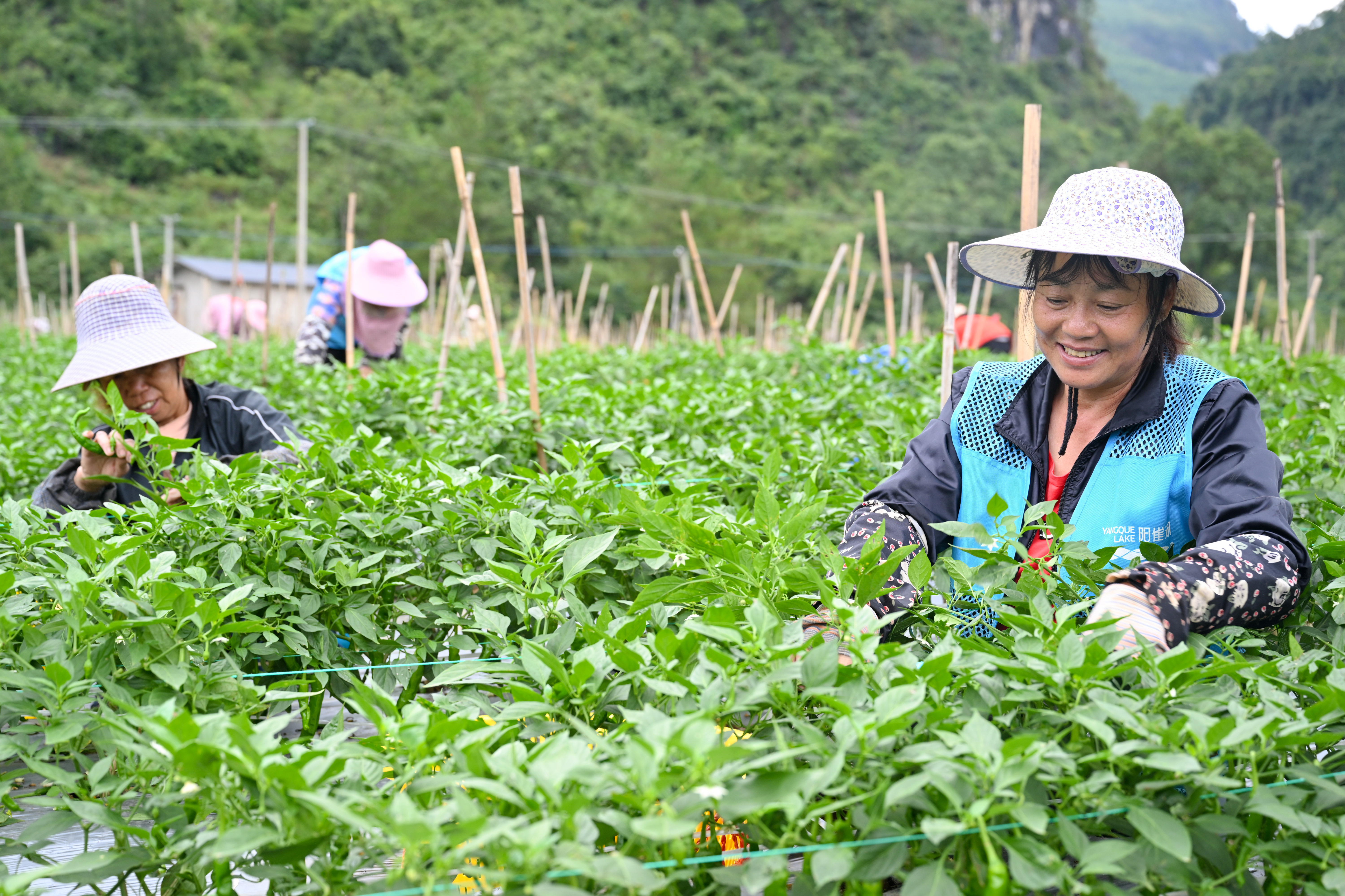 在新建村阳雀湖辣椒栽培基地,放眼望去,连片的辣椒地里,锻真金不怕火的果实垂挂枝端,村民们穿梭其间,熟识地将辣椒采摘下来,蚁合到分拣点进行分类装袋,称重后恭候装车发运。这片基地由百色市阳雀湖农业科技有限公司承包贪图,从育苗到采收的全经由,齐有专科团队把控。