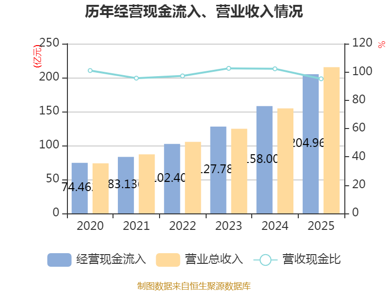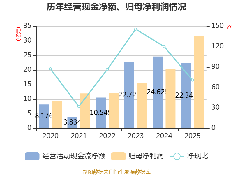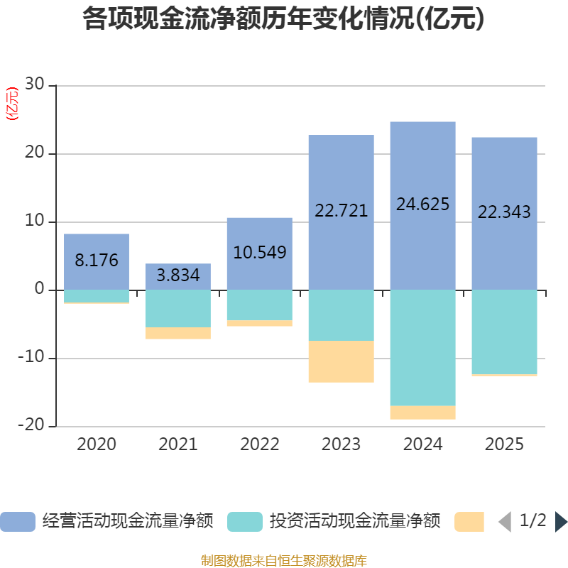 戒指2025年,公司计算动作现款流净额为22.34亿元,同比下落9.27%;筹资动作现款流净额-2798.07万元,同比加多1.71亿元;投资动作现款流净额-12.41亿元,上年同时为-17.05亿元。