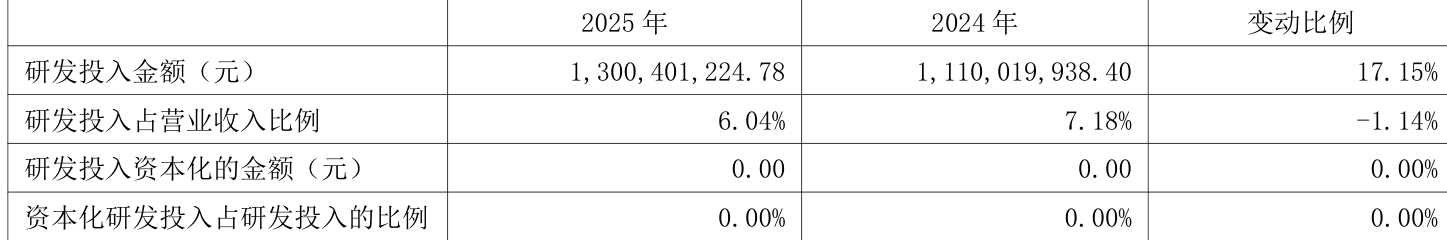 2025年全年,公司研发参预金额为13亿元,同比增长17.15%;研发参预占贸易收入比例为6.04%,比拟上年同时下落1.14个百分点。此外,公司全年研发参预成本化率为0%。