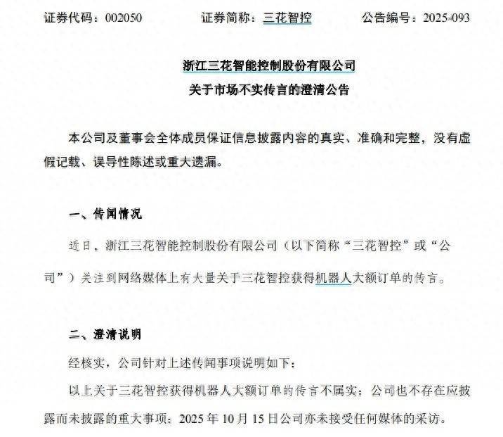 【大河财立方音问】10月15日晚间,三花智控发布理会公告,近日,关心到蚁合媒体上有多数对于三花智控得到机器东谈主大额订单的传言。