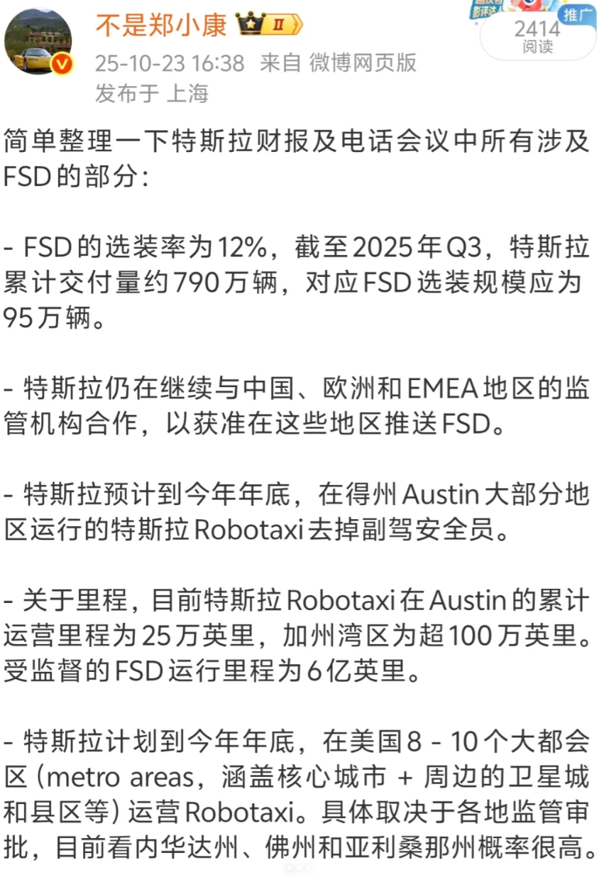 当特斯拉财报走漏FSD选装率达12%、累计拜托限度达95万辆葡萄京娱乐网站娱乐网,同期Robotaxi在奥斯汀、加州等地的运营里程温顺百万英里,这家世界电动车巨头正以“智能驾驶系统生意化+无东谈主驾驶出租车落地”的双轮驱动,重塑汽车产业的明天图景。从用户付费的FSD订阅劳动,到Robotaxi的限度化运营,特斯拉的每一步进展,皆在为自动驾驶的生意化按下加快键。